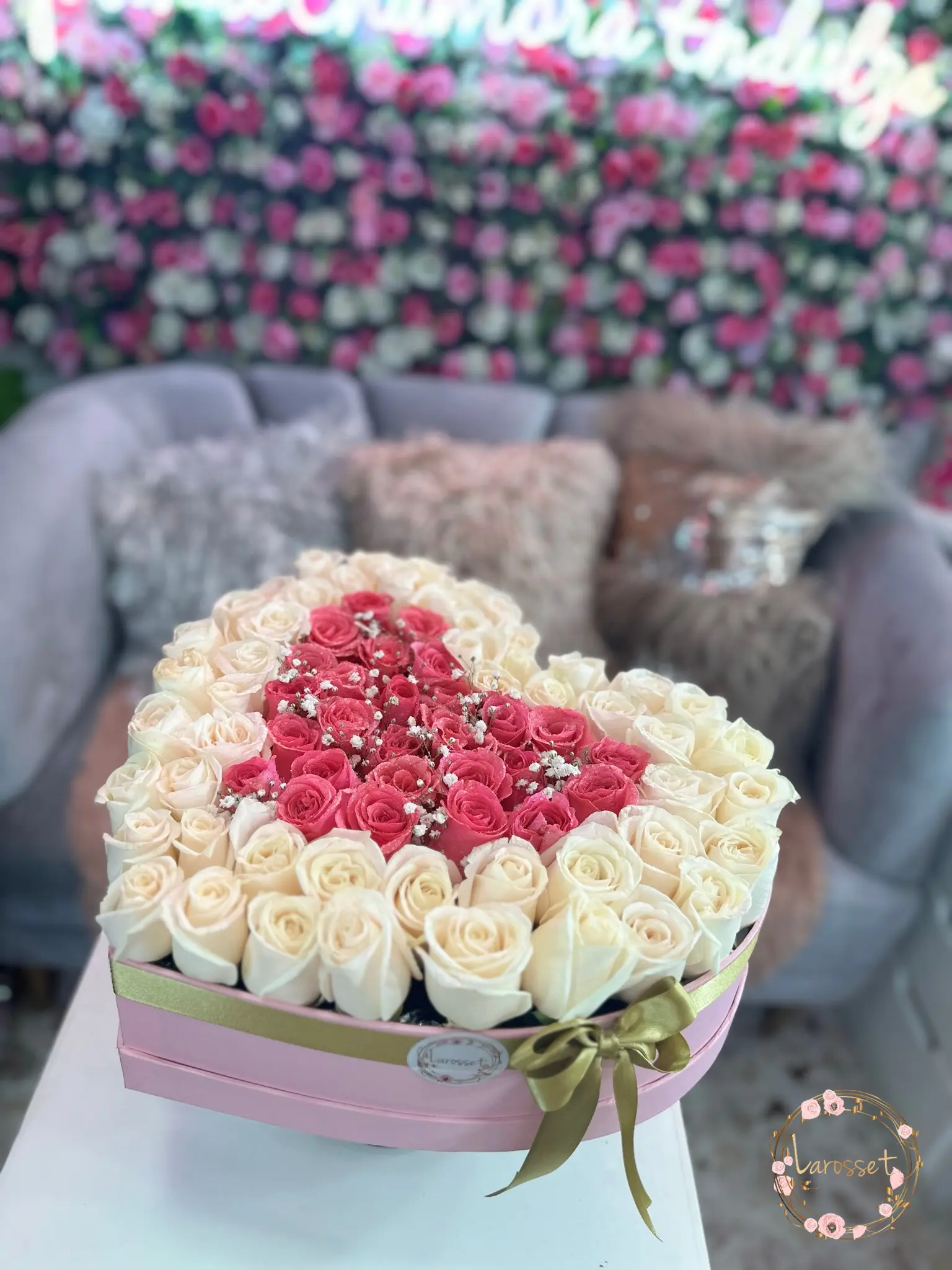 Lujoso box de corazón rosado claro, rebosante de rosas cream que enmarcan un corazón interior de rosas rosadas intensas. Un diseño de alta elegancia con detalles de flor de nube (Gypsophila) y lazo satinado, perfecto para una declaración de amor sublime y tierno.