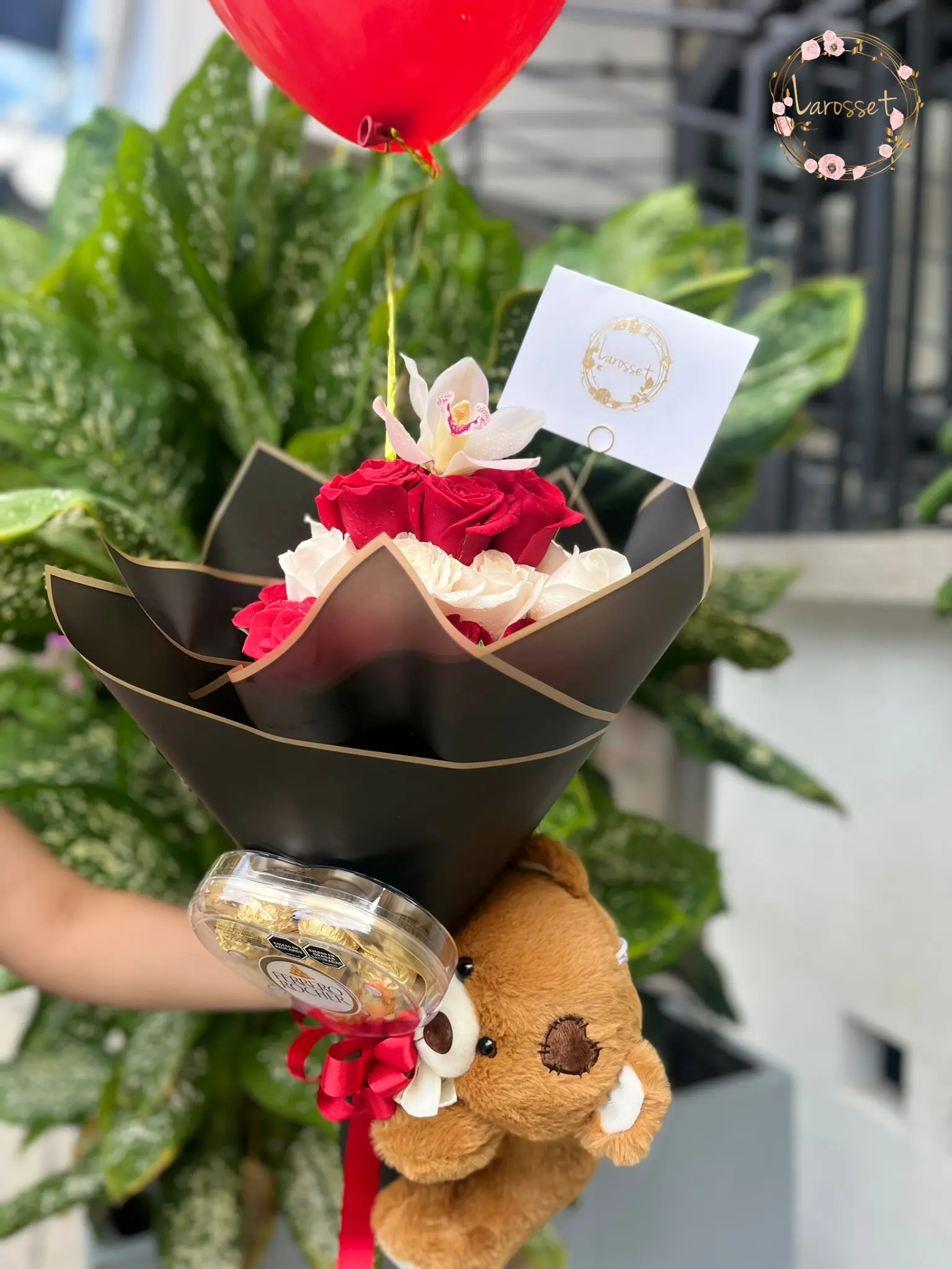Este paquete es la combinación perfecta de ternura y sofisticación en un formato compacto, ideal para una sorpresa espontánea. El corazón del obsequio es un elegante mini-bouquet de rosas rojas y cream, coronado por una delicada orquídea blanca, todo envuelto en un papel negro de diseño que realza el contraste de las flores. El ramo se presenta junto a un adorable oso de peluche de tamaño pequeño y una caja de chocolates Ferrero Rocher cuidadosamente integrada al diseño, creando un regalo que deleita la vista, el paladar y el corazón con un toque de lujo.