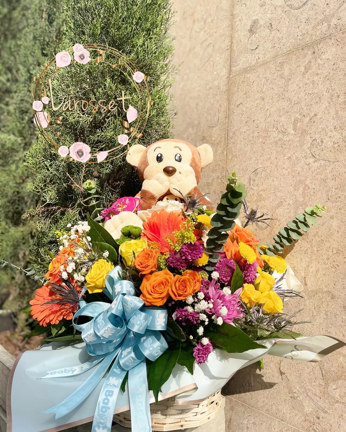 Una canasta floral vibrante con rosas, margaritas y gerberas en tonos cálidos (naranja, amarillo, lila). Incluye un tierno peluche de mono y un lazo azul temático de «Baby». El regalo premium para celebrar la llegada de un bebé con alegría y color.