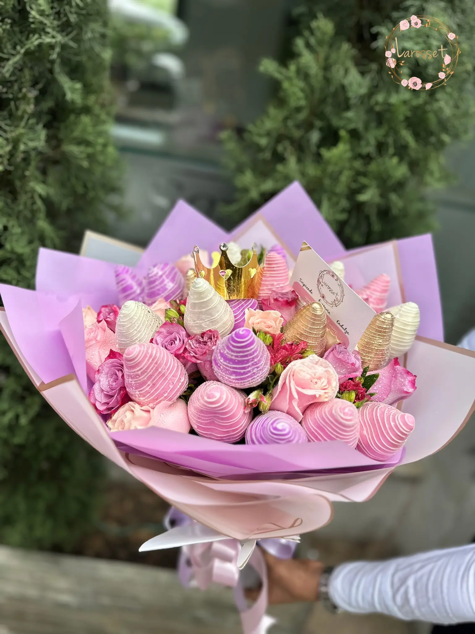 Manojo con 24 rosas 24 fresas con con chocolate.