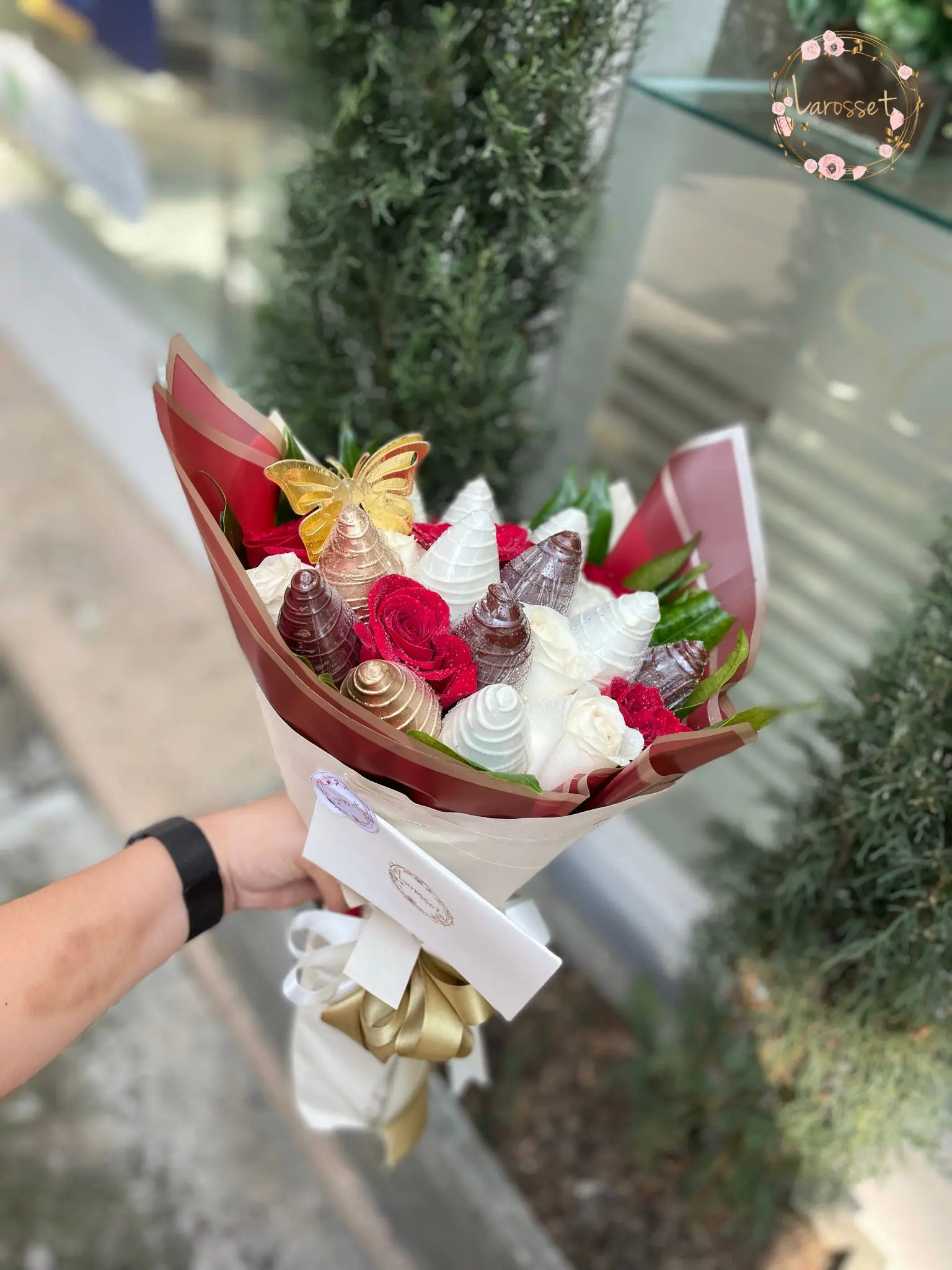 ): Ir al contenidoManojo 12 rosas acompañado de 12 fresas con chocolate