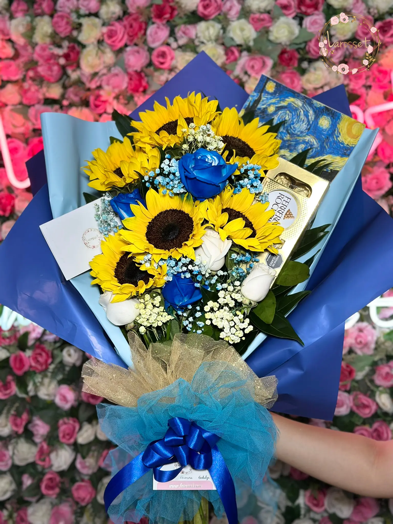Manojo personalizado del color de tu preferencia, con 2 tipos de flor, rosas y girasoles, acompañado de caja de chocolastesx8 ferrero rocher