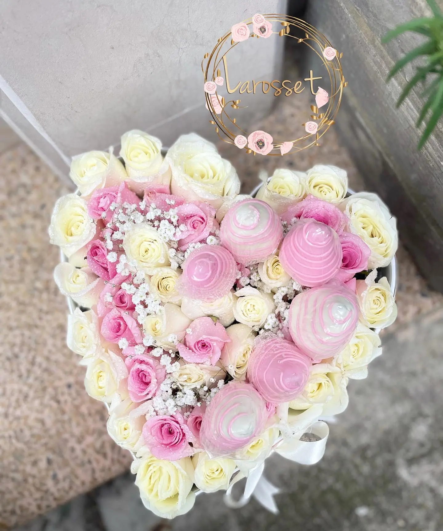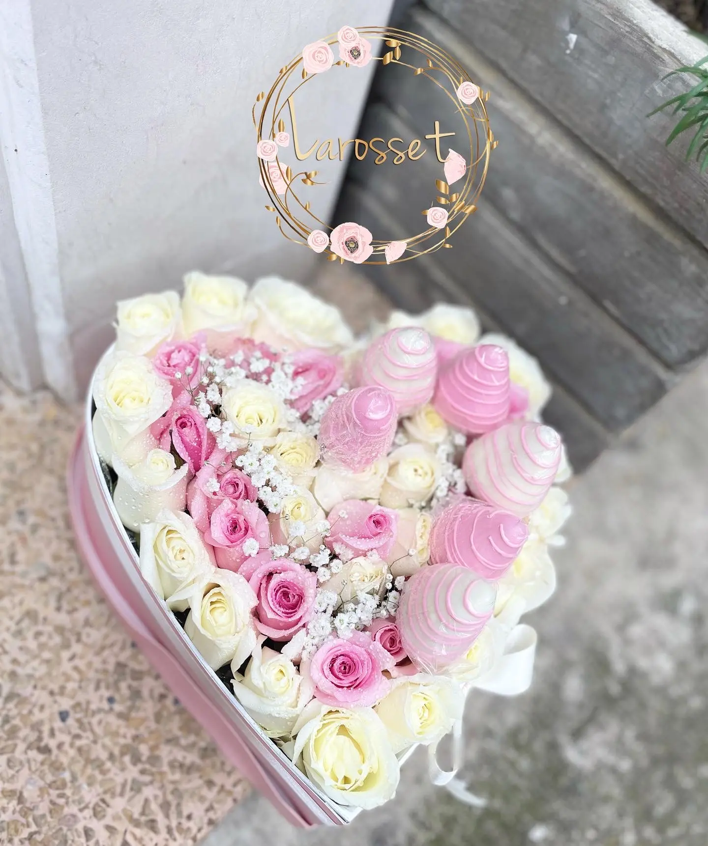 Corazon en rosas con 6 fresas de chocolate