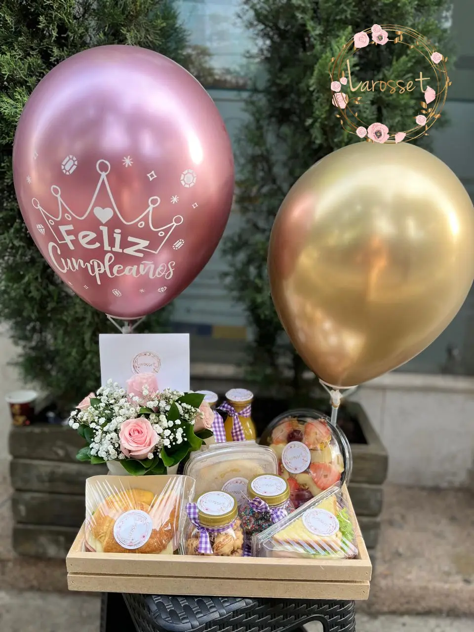 Huevos omelette, ensalada de frutas, sandwich de pollo, jugo de naranja, avena, galletitas, gomas, croassant de jamon y queso, tarjeta con el mensaje que desees, 2 globos