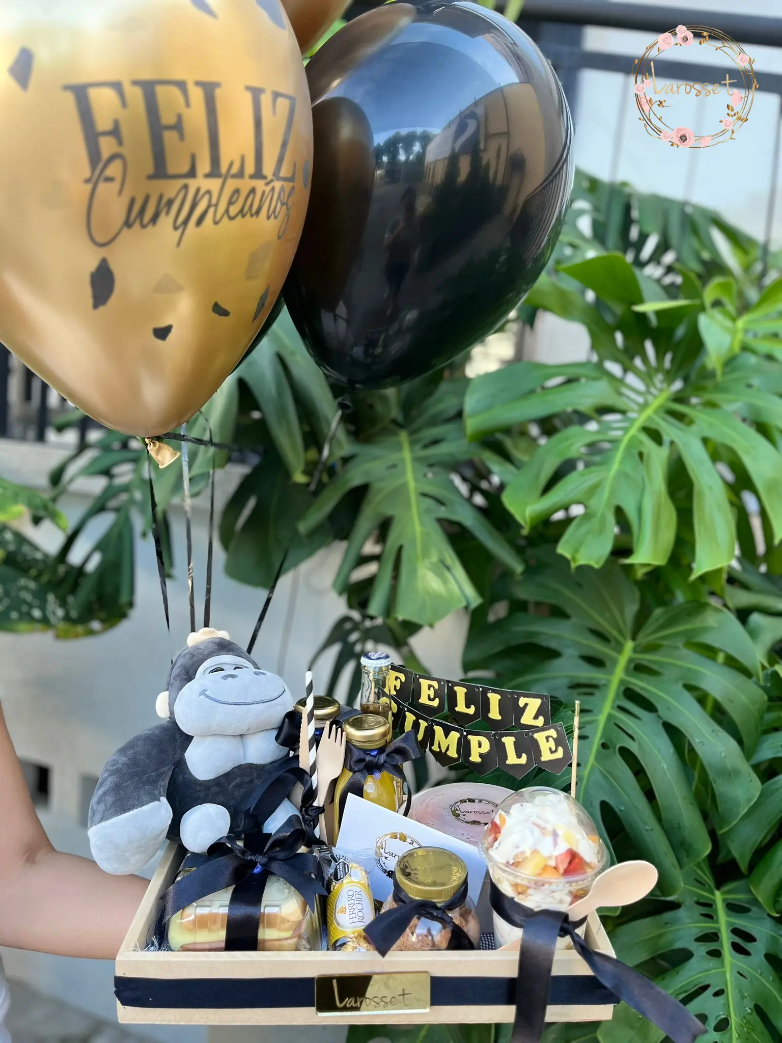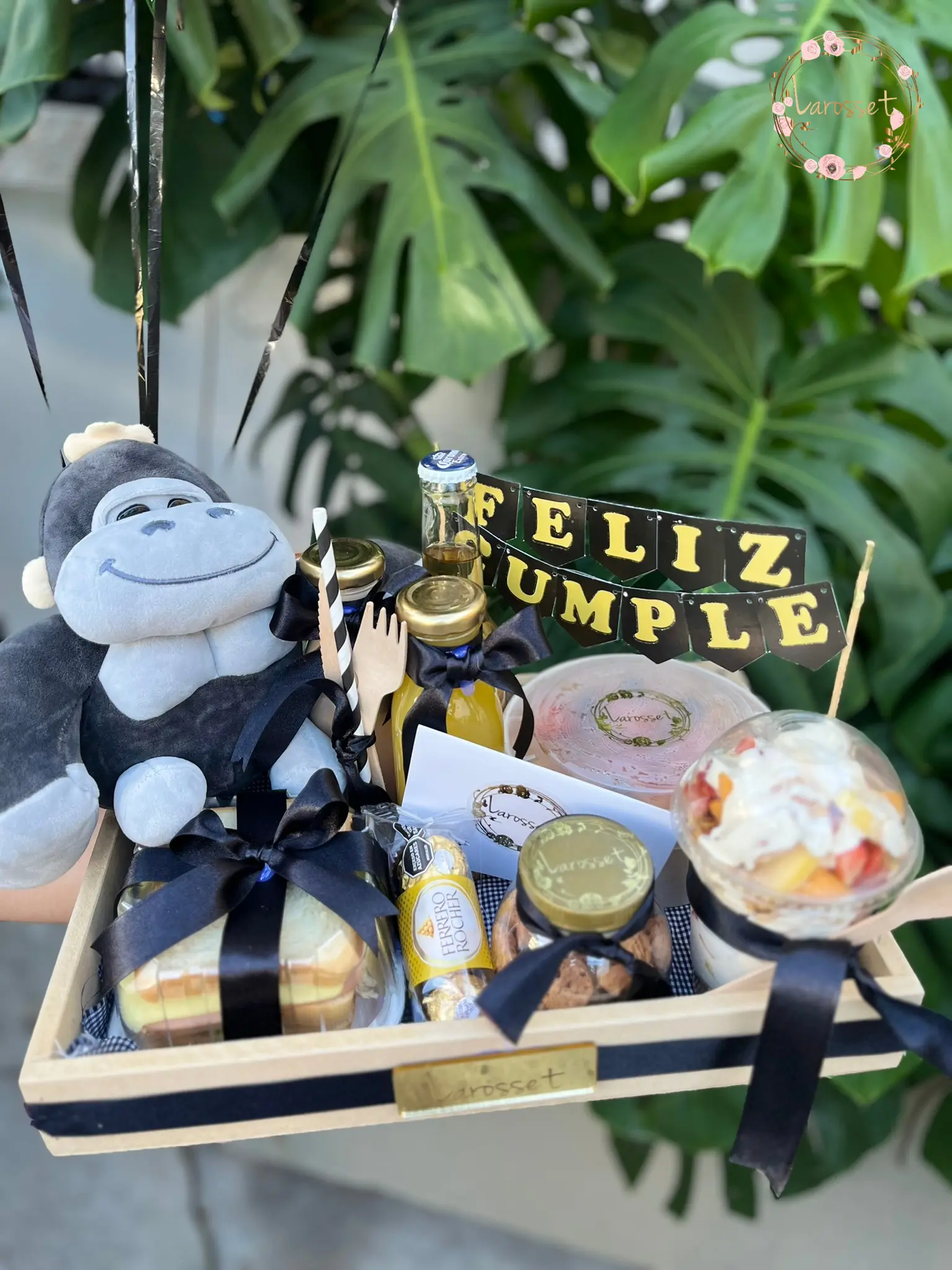 -waffles con fruta, sandwich de pollo, jugo de naranja, Milo, parfait, galletas, 1 coronita, 3 chocolates Ferrero, 1 peluche según disponibilidad, 4 globos en helio y tarjeta con el mensaje que desees.