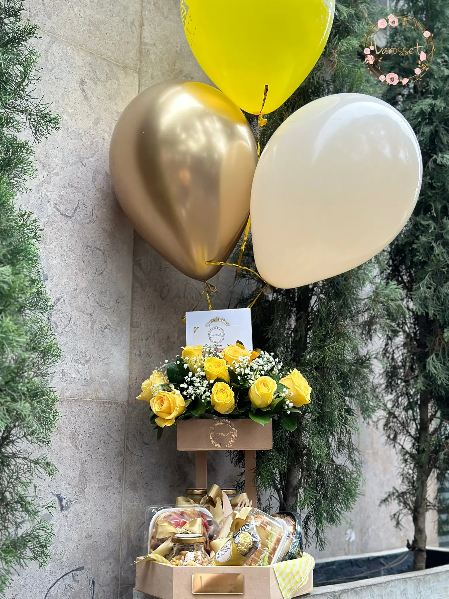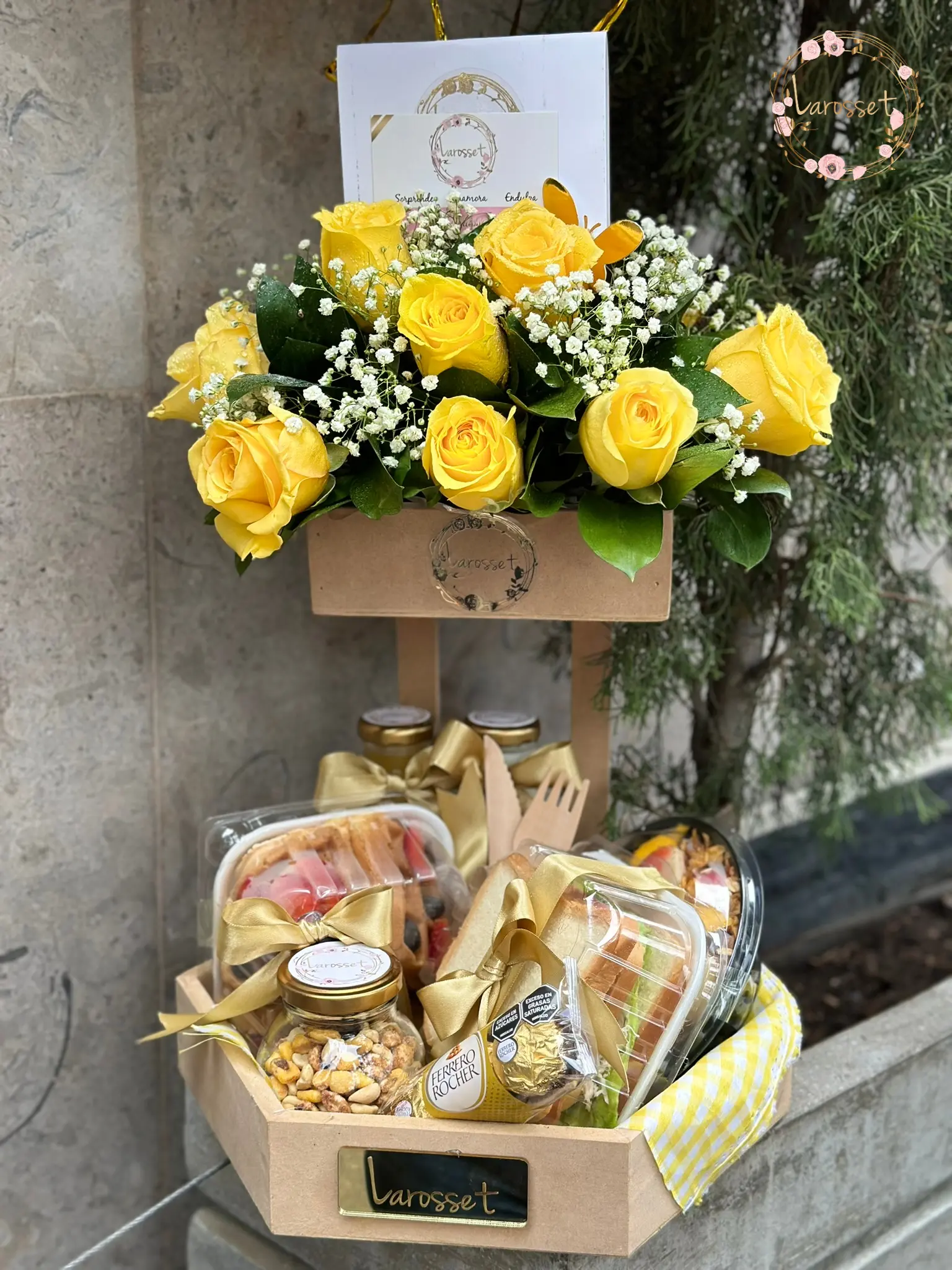 -Hermoso arreglo floral, 3 globos en helio, tarjeta con el mensaje que desees, waffles con fruta, ensalada de frutas, jugo de naranja, avena, sandwich de pollo, frutos secos y 3 chocolates ferrero