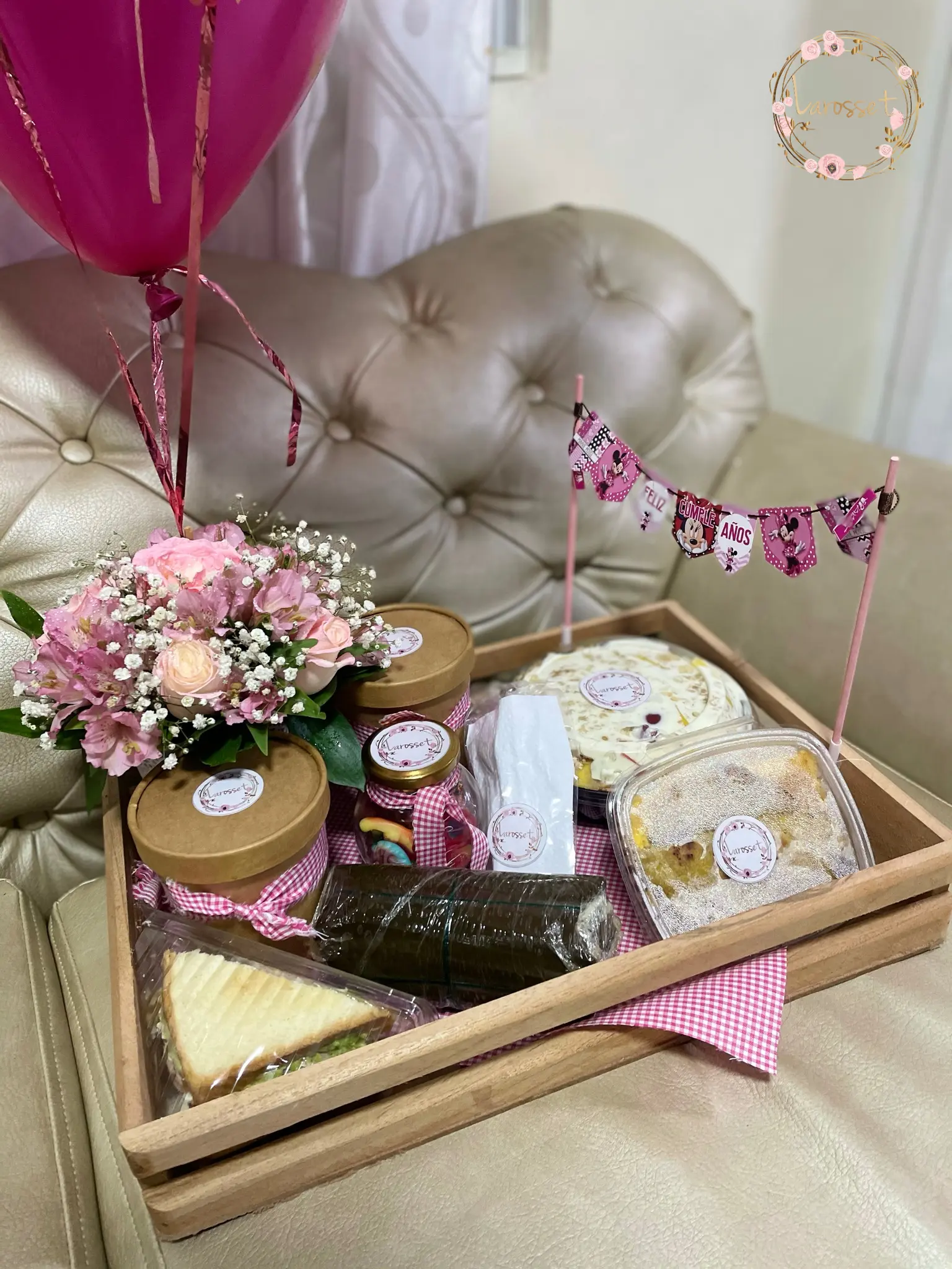 -Huevos omelette, jugo de naranja, sándwich, avena, tamal, frutos secos o gomas, ensalada de frutas, 3 globos ,arreglo floral.