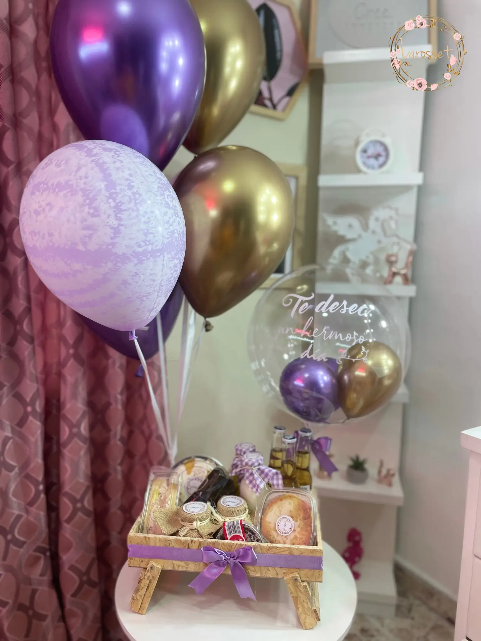 -Huevos omelette, jugo de naranja, sándwich, avena, tamal, frutos secos y gomas, ensalada de frutas, postre, 6globos en helio, 1 globo burbuja y 3 coronitas.