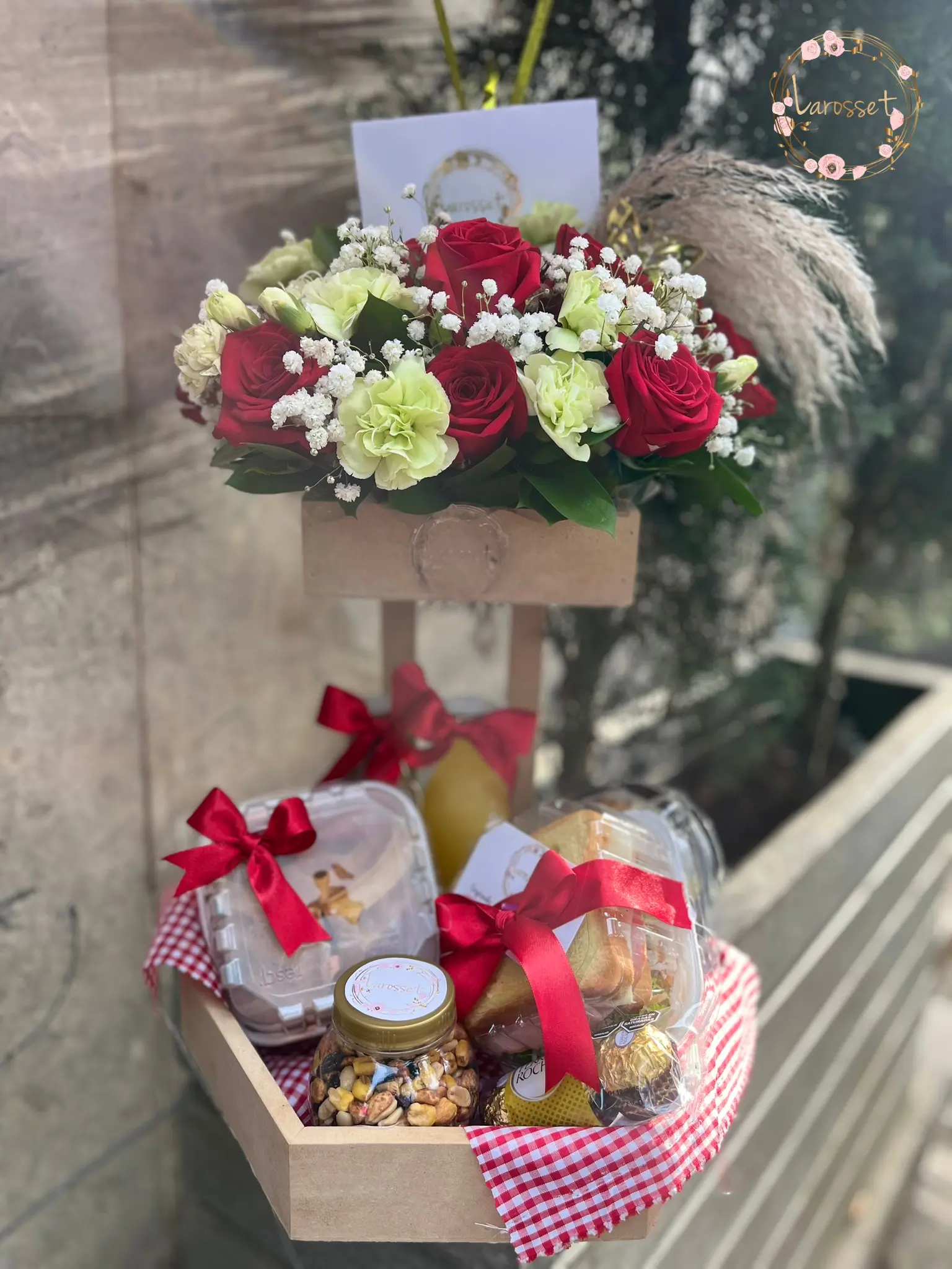 -Hermoso arreglo floral, 3 globos en helio, tarjeta con el mensaje que desees, waffles con fruta, ensalada de frutas, jugo de naranja, avena, sandwich de pollo, frutos secos y 3 chocolates ferrero