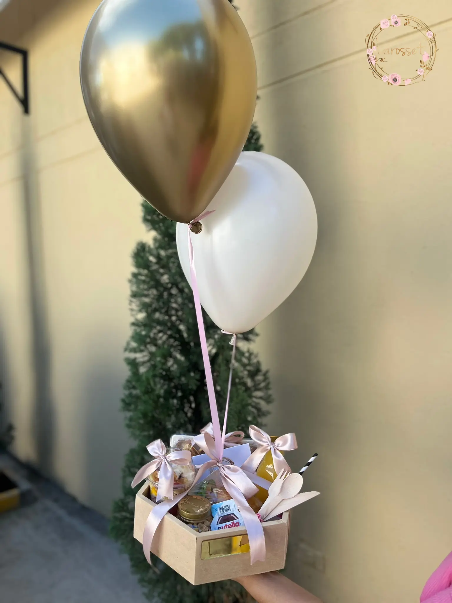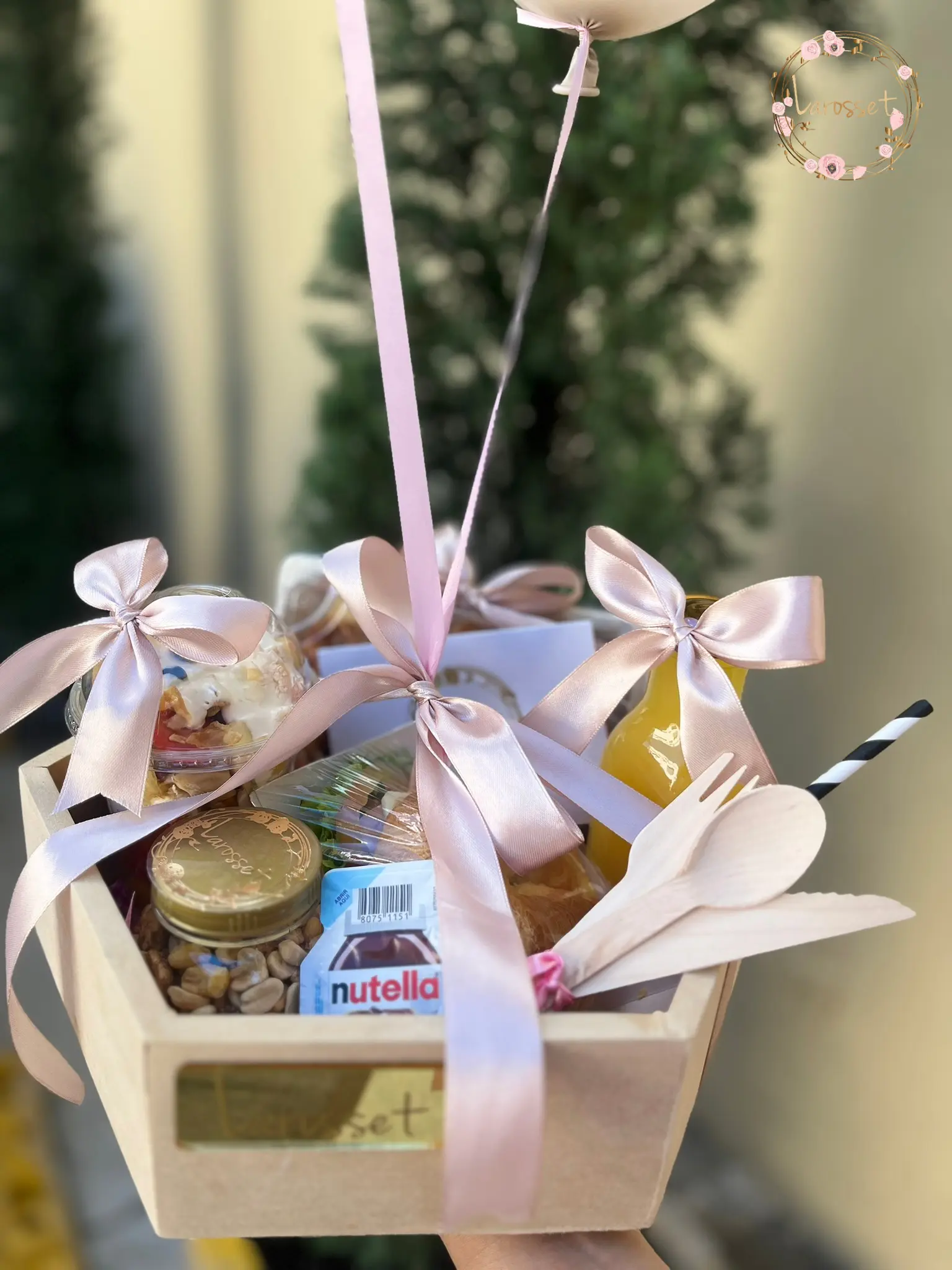Waffles, ensalada de frutas, jugo de naranja, croassant de jamón queso, frutos secos, mininutella,2 globos en helio, tarjeta con el Mensaje que desees.